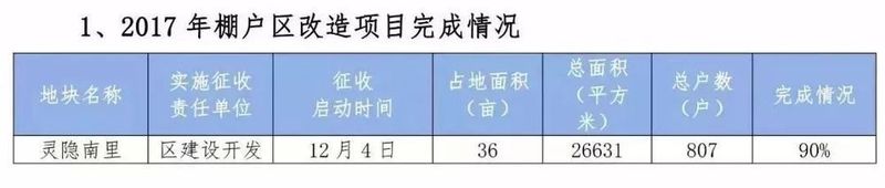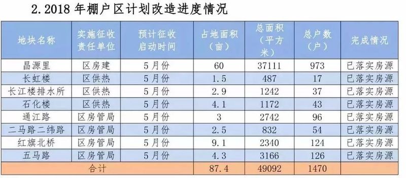 针对成片项目2018年上半年5个项目,包括:阳光里、北海里、合兴里、东宿舍、东孙台实现结片。下半年3个项目,包括:汪庄子、郑庄子、振中路实现基本净地。