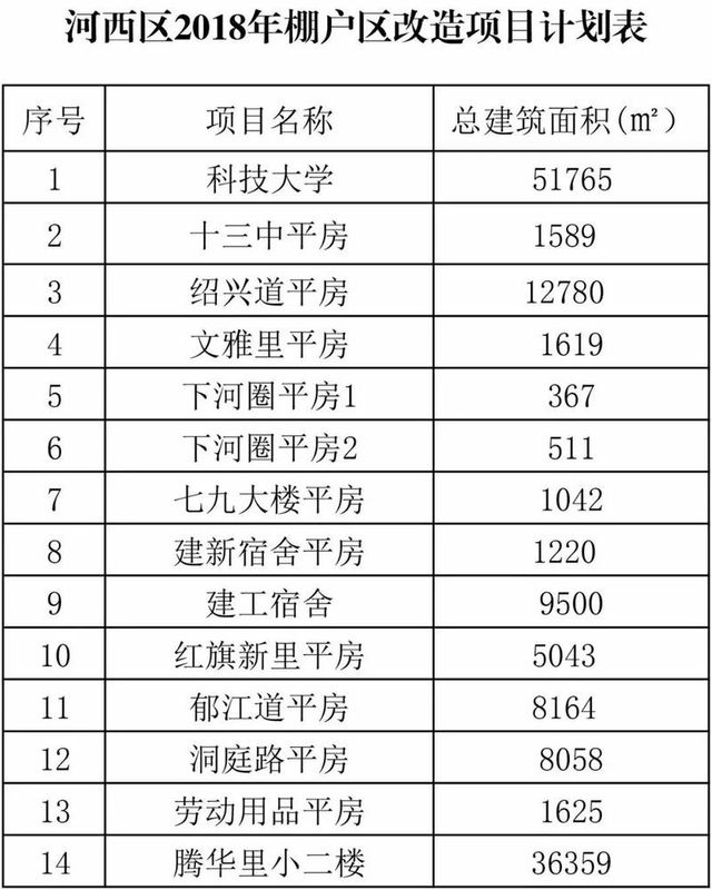 2017年,河西区已经完成改造5.89万平米任务。2018年计划启动14片13.96万平方米棚户区改造。这14片分别为科技大学片、十三中片、郁江道片、绍兴道片、文雅里平房、下河圈平房(包含两个片区)、七九大楼平房、建新宿舍、建工宿舍、红旗新里、洞庭路平房、劳动用品平房、腾华里小二楼片,共计涉及居民约2700余户。