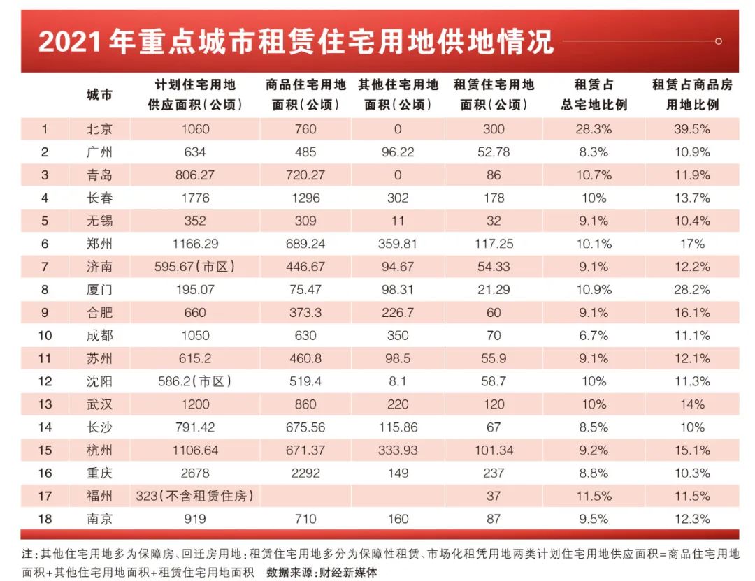 土地供给方面,2017年,北京、上海、沈阳、南京、杭州、合肥、厦门、郑州、武汉、广州、佛山、肇庆、成都等13个城市被列为首批利用集体建设用地建设租赁住房试点,2019年,福州、南昌、青岛、海口、贵阳等5个城市列入试点,试点城市增加至18个。如今,北京、上海等多个城市已经纷纷开展利用集体经营性用地、调整商业用地等措施扩大租赁住房土地供给。“十四五”规划纲要明确“单列租赁住房用地计划”。近期已有18个热点城市发布集中供地计划,全部将租赁住房用地单列。例如北京今年计划住宅用地供应面积1060公顷,其中租赁住房用地面积达300公顷,占总住宅供地计划的28.3%。青岛、郑州、厦门、沈阳、武汉、福州等城市租赁住房用地占比也达到或超过10%。