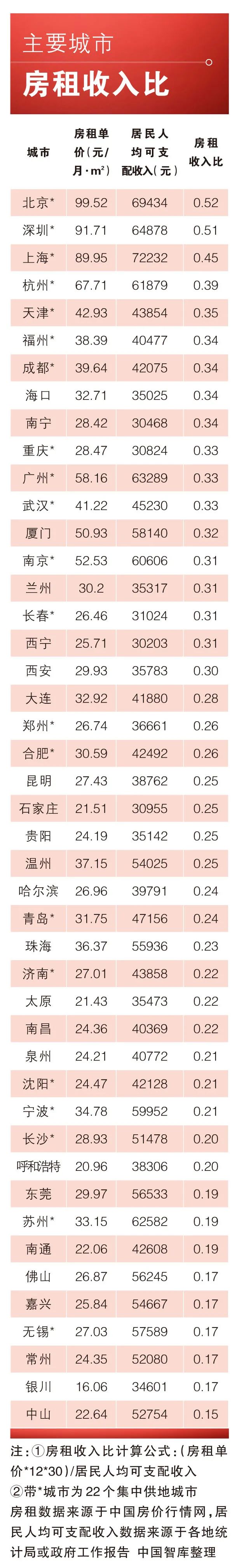 对于租房压力,中房智库以房租收入比作为衡量指标来判断。近日绝大部分一二线城市公布了2020年城市居民人均可支配收入情况,中房智库梳理了45个热点一二线城市,结合中国房价行情网公布的3月份房租数据,按照人均租住面积30平方米计算出房租占人均可支配收入的比重。数据显示,北京以房租收入比0.52占据租房压力榜榜首,深圳、上海分别以0.51、0.45紧随其后。意味着人均租住面积30平方米的情况下,北京、深圳的租房成本要占到可支配收入的一半以上,如果单独租住普通住宅(面积多为60平方米以上),租住成本几乎会覆盖整个可支配收入。