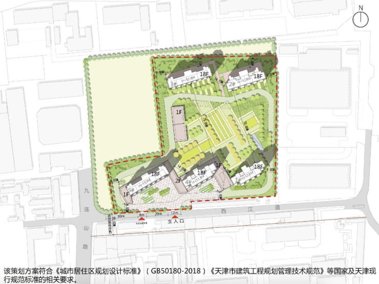 小区主出入口设置在西江道一侧,此外,还设置了一个消防应急车道。