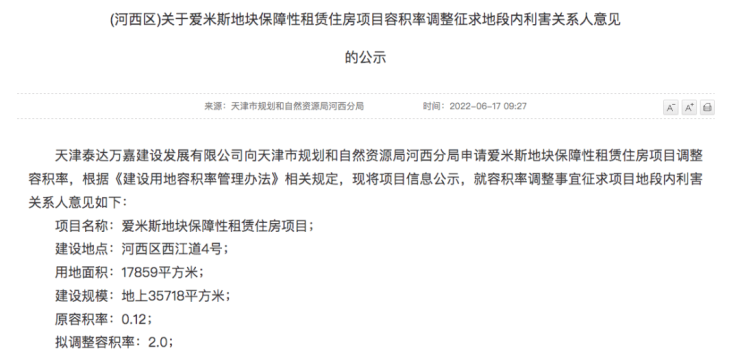 近日,天津市规划和自然资源局河西分局释出了《(河西区)关于爱米斯地块保障性租赁住房项目容积率调整征求地段内利害关系人意见的公示》。