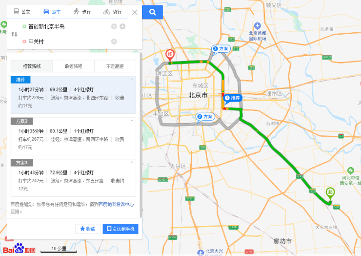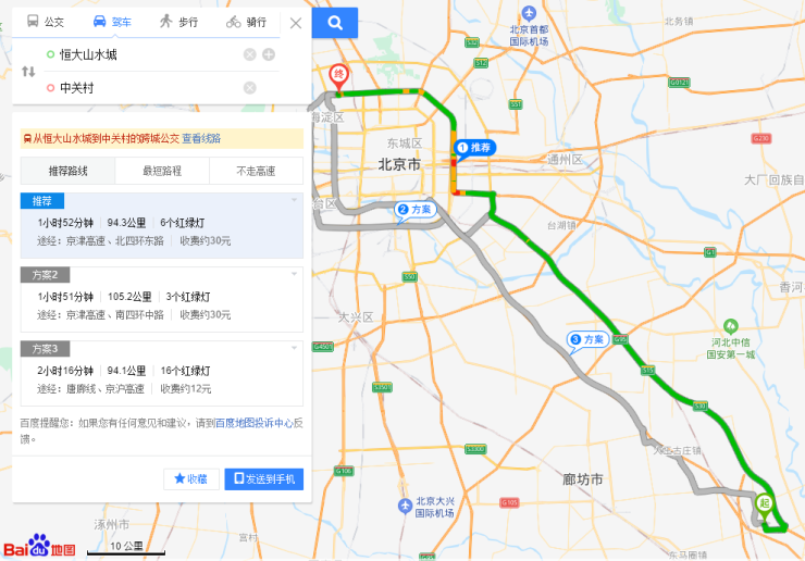 可见,从相对适合自驾通勤的板块通勤北京工作单位(以中关村地铁站为例)所需的大致时间为1小时30分到1小时45分钟,这种通勤方式理论上比乘坐城际列车出行再换乘地铁更方便,如果9点上班,大概7:15-7:30出发即可,而且不用担心晚上加个班就会无家可归的问题。