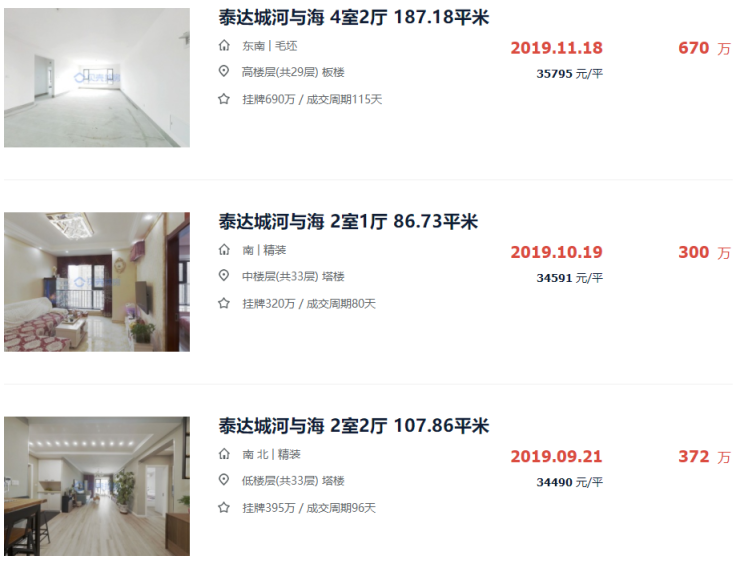 而泰达城河与海在去年下半年成交的3套二手房,无论是86平米小两居,还是107平米大两居,亦或是187平米大户型四室两厅,成交均价均在3.5万/平米上下,未超过3.6万/平米。