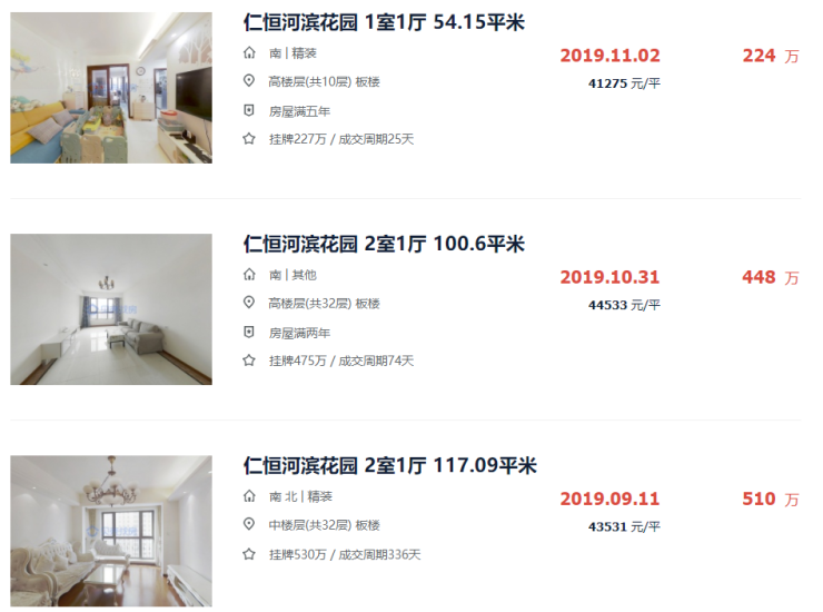 其中,去年10月31日,仁恒河滨花园出售的一套100.6平米2室1厅,以448万元成交,均价44533元/平米。