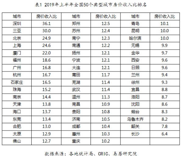 下图为2019年上半年全国50个主要城市的房价收入比: