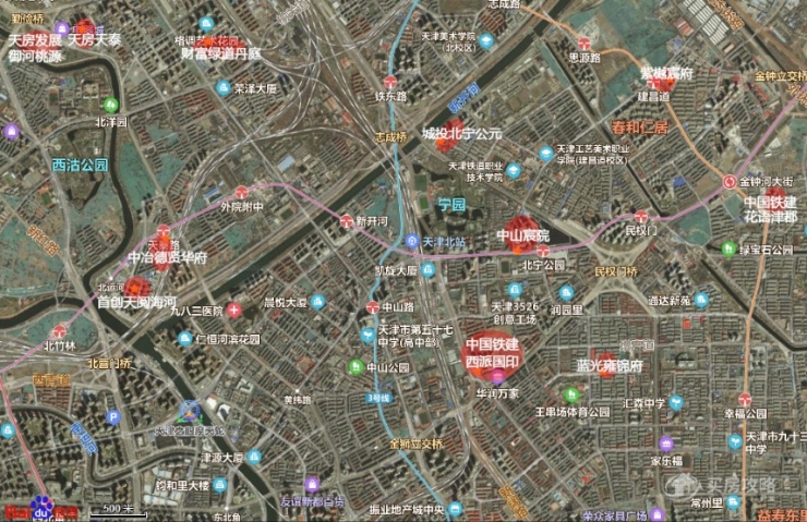 从图上可以明显看出,从邻近三岔河口的首创、中冶,到白庙的两个天房项目,再到中山路、金钟河大街、王串场、民权门、建昌道的楼盘,河北区在同一时期同一板块内很难出现三个以上的新房楼盘,可以说是相当散了。