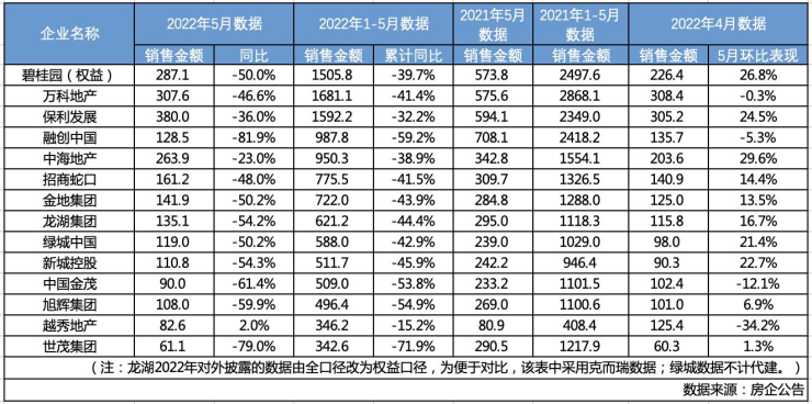 以克而瑞发布的5月份销售榜为例,TOP20房企中,除了华润置地尚未披露单月数据,绿地、滨江、金科、华发、建发等5家房企不单独对外披露月度销售数据外,截至6月16日,已有14家房企发布了5月份未经审核的营运数据。