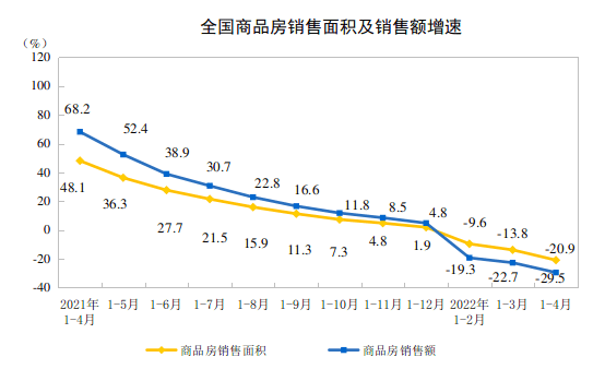 今年1-4月份,房地产开发企业房屋施工面积818588万平方米,同比持平。其中,住宅施工面积577692万平方米,同比下降0.1%。房屋新开工面积39739万平方米,下降26.3%。其中,住宅新开工面积28877万平方米,下降28.4%。房屋竣工面积20030万平方米,下降11.9%。其中,住宅竣工面积14662万平方米,下降11.4%。