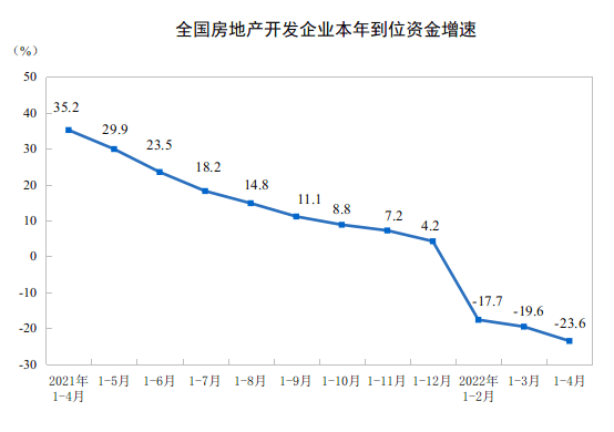 今年1-4月份,房地产开发企业到位资金48522亿元,同比下降23.6%。