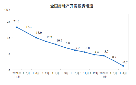 国家统计局数据显示,1-4月份,全国房地产开发投资39154亿元,同比下降2.7%;其中,住宅投资29527亿元,下降2.1%。