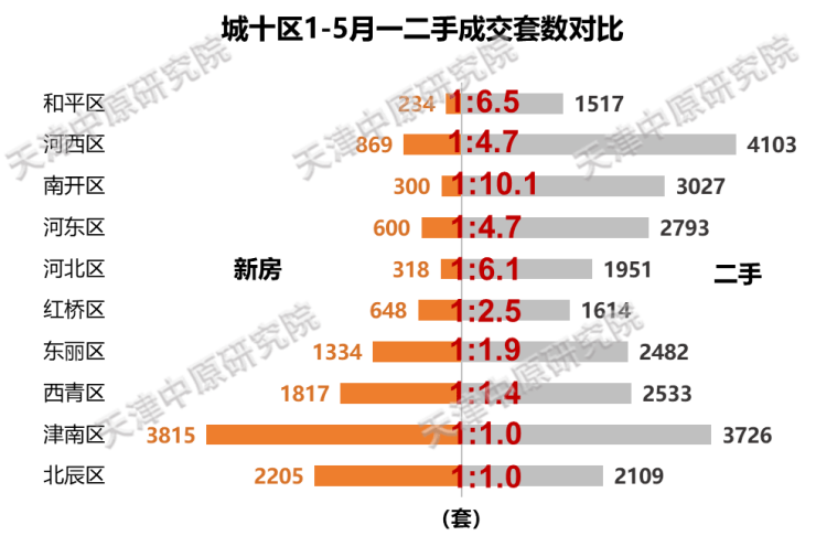 中心城区一二手成交套数比1:5,南开区新房市场高改化,挤压市场需求向二手集中释放,一二手套数比达全市较低;环城四区二手市场扩容明显,东丽环内、西青南站片区二手市场值得关注。