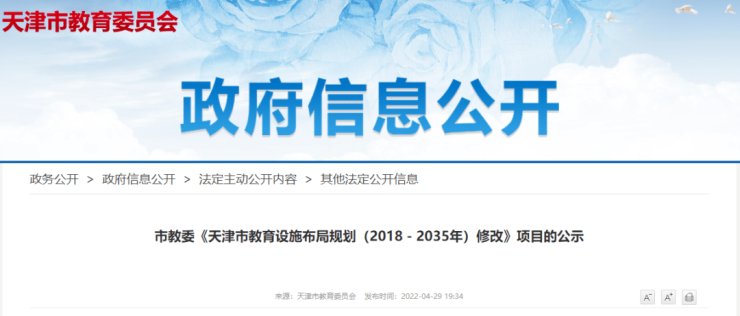 近日,天津市教委网站发布了《天津市教育设施布局规划(2018-2035年)修改》项目的公示,其中指出——