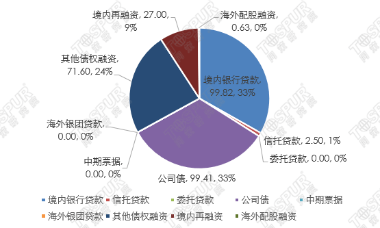债权融资方式包括,境内银行贷款(99.82亿元,占比33.17%)、公司债(99.41亿元,占比33.03%)、其他债权融资(71.6亿元,占比23.79%)、信托贷款(2.5亿元,占比0.83%)、中期票据、海外银团贷款、委托贷款(均为0亿元,占比0%)。 2022年4月典型上市房企债权融资情况(单位:亿元)