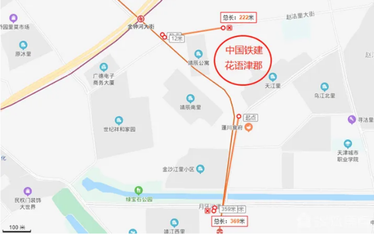 先来看,中国铁建·花语津郡,位于河北区群芳路与靖江北路交口东北侧,社区北侧出口距离地铁5、6号线换乘站——金钟河大街站的E口仅有约220米,社区南门距离地铁5号线月牙河站约370米,且南门不足100米的月牙河公交站有15路、353路、608路、609路、871路、911路和通勤911路,公交出行十分便捷。