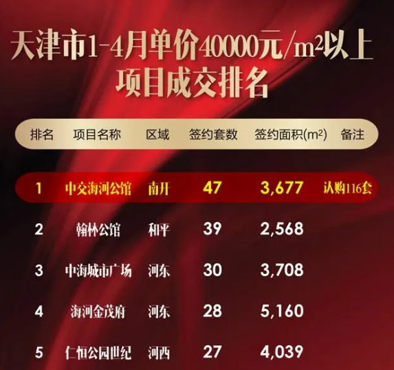 据悉,中交海河公馆在今年1-4月均价40000元/㎡以上项目成交排名排名前列,成为天津高端项目的“领头羊”,一方面是项目推出的促销优惠,另一方面也是地段和配套的强大。