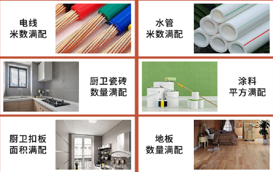 第三重“六不限”,电线米数、水管米数、厨卫瓷砖数量、涂料平方、厨卫扣板面积、地板数量均承诺满配,全程无增项。