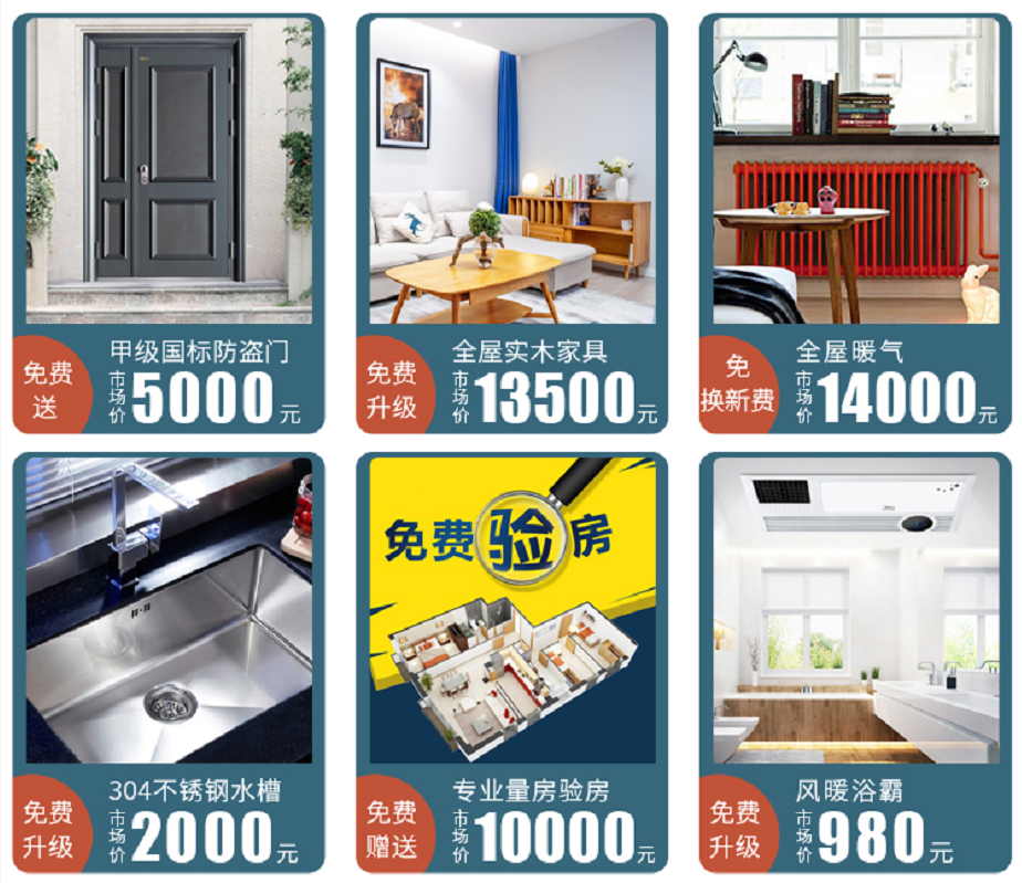 第二重“六免”,市场价5000元的甲级国标防盗门免费送;免费升级市场价13500元的全屋实木家具;市场价14000元的全屋暖气免费换新;免费升级市场价2000元的304不锈钢水槽;免费赠送市场价10000元的专业量房验房服务;免费升级市场价980元的风暖浴霸。优质提升家装品质,享有百分百的收获感。
