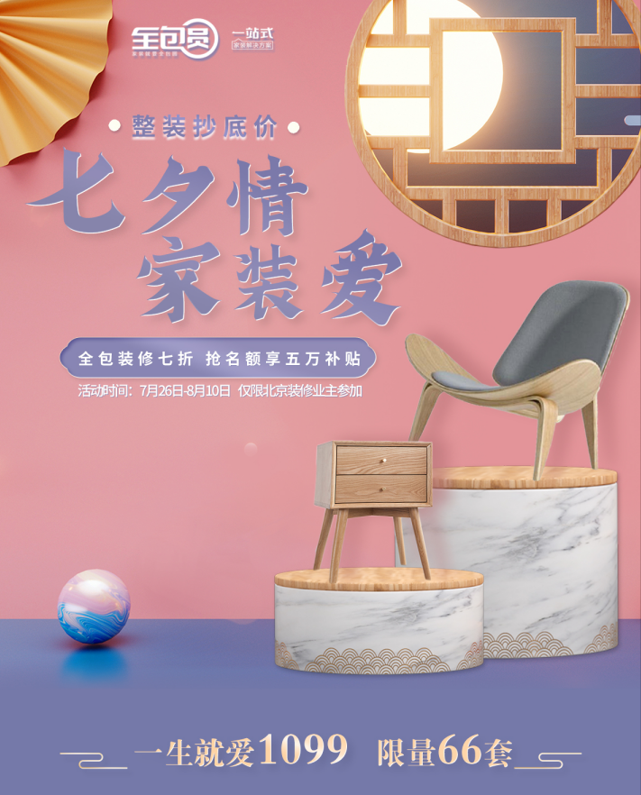 七夕活动期间,66套限量装开抢,数量有限,且仅限北京地区装修业主参与,1099元/㎡价格(此价格不含税金及管理费)即可实现家居设计、品质、施工、保障“四项升级”,花最少的钱,装较好的家。