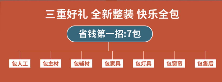 排名前列重“七包”,包人工、包主材、包辅材、包家具、包灯具、包窗帘、包售后,带给业主“一站式”全包的省心和完工直接“拎包入住”的称心。