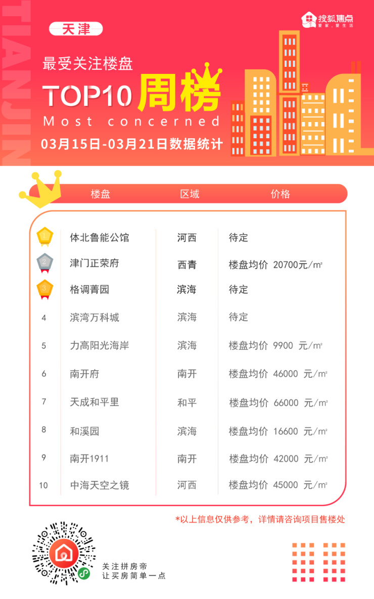 根据榜单,此次上榜的新房有体北鲁能公馆、南开府、天成和平里、南开1911、中海天空之境。