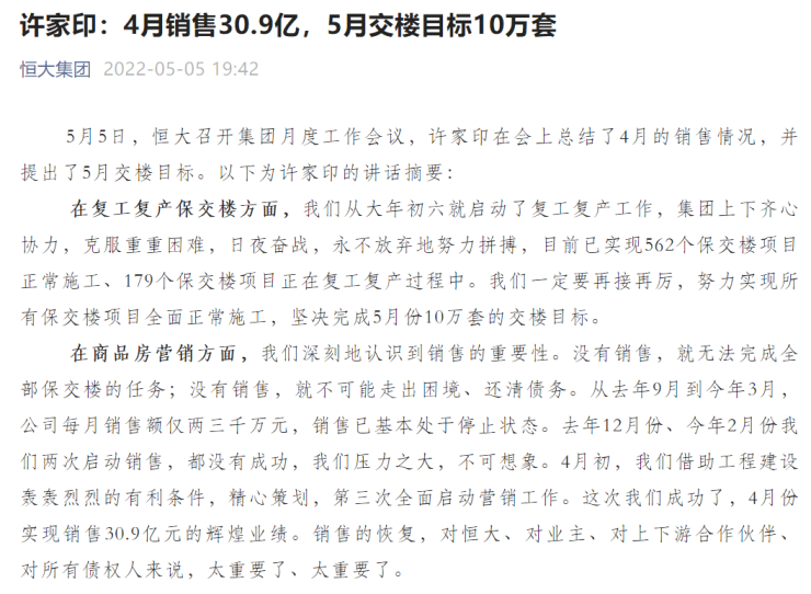 5月5日,恒大召开集团月度工作会议,许家印表示,恒大从大年初六就启动了复工复产工作,集团上下齐心协力,目前已实现562个保交楼项目正常施工、179个保交楼项目正在复工复产过程中。4月份实现销售30.9亿元,坚决完成5月份10万套的交楼目标。