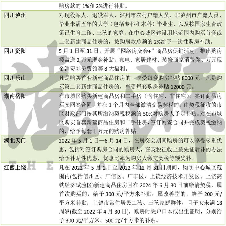 拿江苏连云港来说,连云港市住建局于5月17日发布《连云港市市区支持居民刚性和改善性住房消费实施细则》,2022年5月18日至2022年6月30日期间内,对市区(不含赣榆区)居民购买新建的家庭少有住房和第二套改善性住房予以补贴。其中,对购买的系家庭少有住房90平方米以下(含90平方米)和90平方米以上的分别按购房款的1%和1.5%进行补贴;对购买的系第二套改善型住房90平方米以下(含90平方米)和90平方米以上的分别按购房款的1%和2%进行补贴。