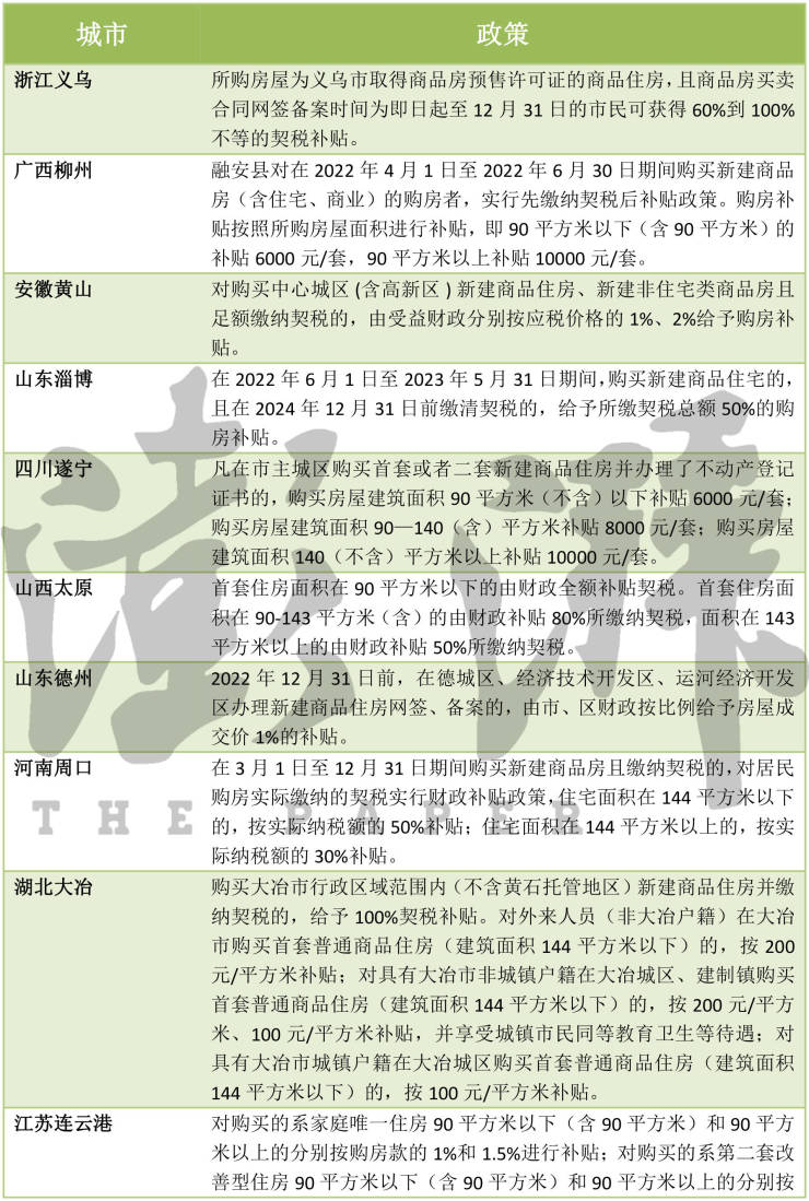 据澎湃新闻不完全统计,5月以来,包括浙江义乌、广西柳州、安徽黄山、山东淄博、四川遂宁、山西太原、山东德州、河南周口、湖北大冶、江苏连云港、四川泸州、四川资阳、四川乐山、湖南岳阳、湖北天门、江西上饶等近20城发布契税及购房款补贴,带动楼市需求。以浙江义乌为例,5月26日,义乌市房地产市场平稳健康发展领导小组办公室发布《义乌市2022年购房契税补贴实施细则》。该细则规定,所购房屋为义乌市取得商品房预售许可证的商品住房,且商品房买卖合同网签备案时间为即日起至12月31日的市民可获得60%到100%不等的契税补贴。
