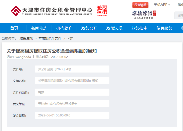 2022年6月1日,天津市住房公积金管理中心网站发布《关于提高租房提取住房公积金较高限额的通知》,原文如下: