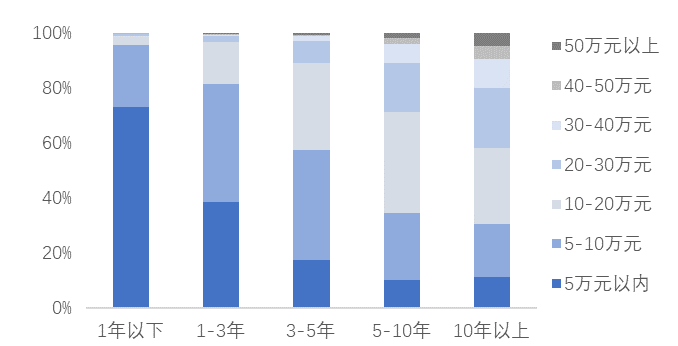 收入方面,调研结果显示,超6成房产经纪人年收入水平在5万元以上,高于2020年全国居民人均可支配收入3.2万元。分从业时长看,从业年限10年以上的经纪人中年收入在20万元以上的比例为41.8%,从业年限在3-5年的经纪人中年收入在20年元以上的比例为10.7%,而在从业年限1年的经纪人中不到1%收入水平达20万元以上。随着从业年限的增加,更加专业熟练的业务能力,以及不断累积的客源房源资源,都将助力经纪人获得更高的收入水平。
