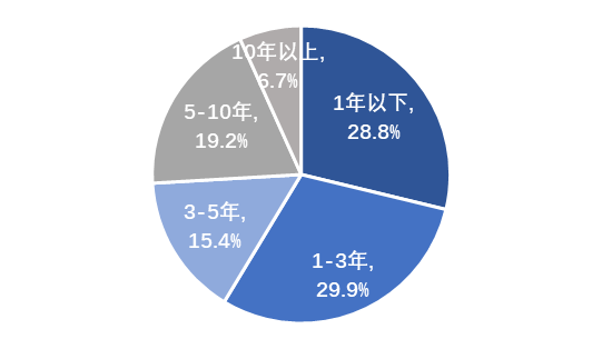 调查显示,从业年限在3年以下的房产经纪人占比达58.7%,从业10年以上的经纪人占比仅6.7%,而在房产经纪业务发展较为成熟的美国,10年以上从业者占比已达59%。整体上看,中国房产经纪人的稳定性较弱。分城市看,一线城市房产经纪服务者的从业稳定性整体高于其他能级城市,工作年限在3年以上的经纪人占比57.8%,高于样本城市整体16个百分点。