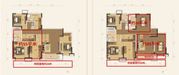 约28米双层顶跃极质层高,上下多维立体互动,全方位动感体验,大平层的尺度感与视野性与纯跃层的空间感与私密性兼而有之。