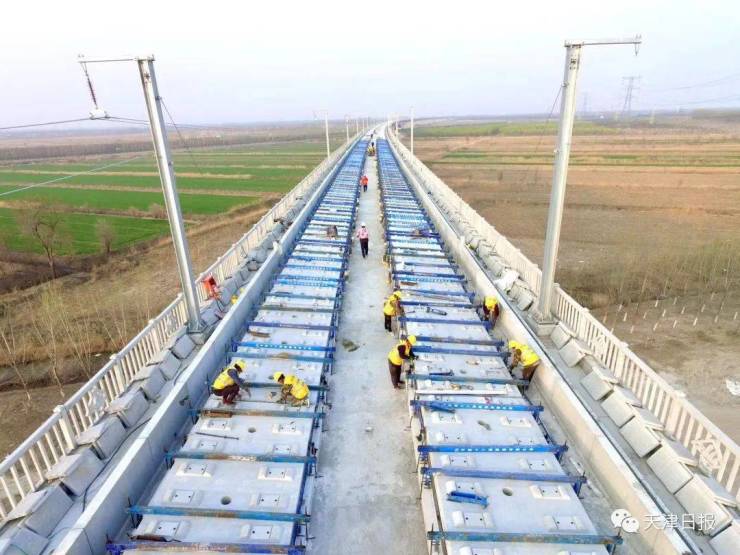 4月4日晚,随着京滨城际铁路北辰特大桥最后一组无砟轨道道床板混凝土浇筑完成,标志着由驻津央企中铁十八局等单位承建的京滨城际铁路宝坻至北辰段的无砟轨道施工任务全面完成,为后续铺轨作业和线路开通运营创造了有利条件。记者 张磊 摄
