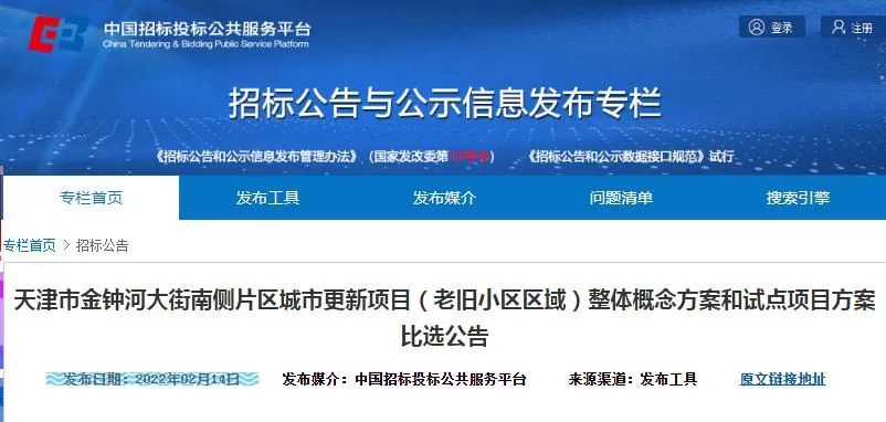 此前信息显示,2月14日,由天津城投建设工程管理咨询有限公司作为招标代理机构,在“中国招标投标公共服务平台”发布“金钟河大街南侧片区城市更新项目(老旧小区区域)整体概念方案和试点项目方案比选公告”,标志着津城排名前列大型片区类城市更新项目正式进入建设实施阶段。
