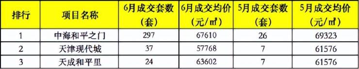 中交海河公馆排在第二,6月签约了15套,和5月持平;成交均价较5月有所下降,每平米降了约2000多元。
