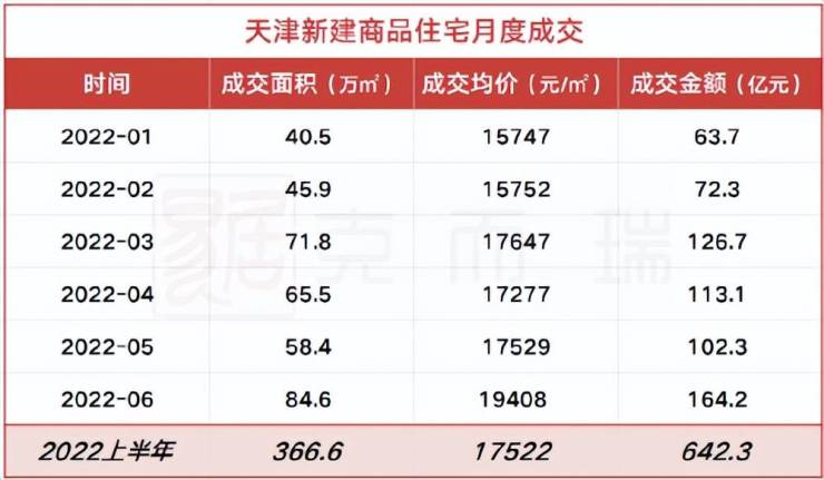 6月,天津新建商品住宅成交量约84.6万㎡,环比上涨45%;成交金额约164.2亿元,环比上涨61%;成交均价19408元/㎡,环比上涨11%;