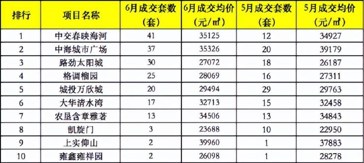排在第五的是中交融成,6月签约了24套,较5月翻倍;成交均价37618元/㎡,较5月微涨。