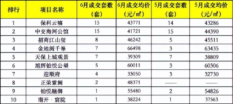 保利云禧由上个月的第二窜到了排名前列的位置;6月签约了15套,较上个月多了1套;成交均价比较稳定,在4万3左右。