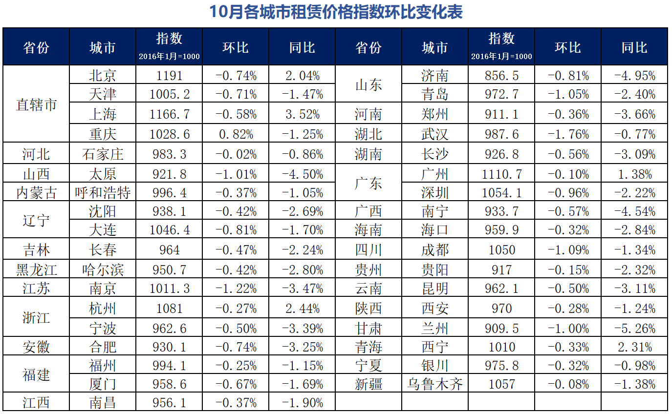从环比方面看,其监控的35个城市中,仅重庆(0.82%)1个城市租赁价格指数出现上涨,上涨城市数量比9月份减少了7个。其余34个城市(石家庄、乌鲁木齐、广州、贵阳、福州、杭州、西安、海口、银川、西宁、郑州、呼和浩特、南昌、沈阳、哈尔滨、长春、宁波、昆明、长沙、南宁、上海、厦门、天津、北京、合肥、大连、济南、深圳、兰州、太原、青岛、成都、南京、武汉)租赁价格指数均出现不同程度下跌,下跌城市数量比9月增加7个。其中,武汉跌幅(-1.76%)居首,其次是南京和成都,分别下跌1.22%和1.09%。