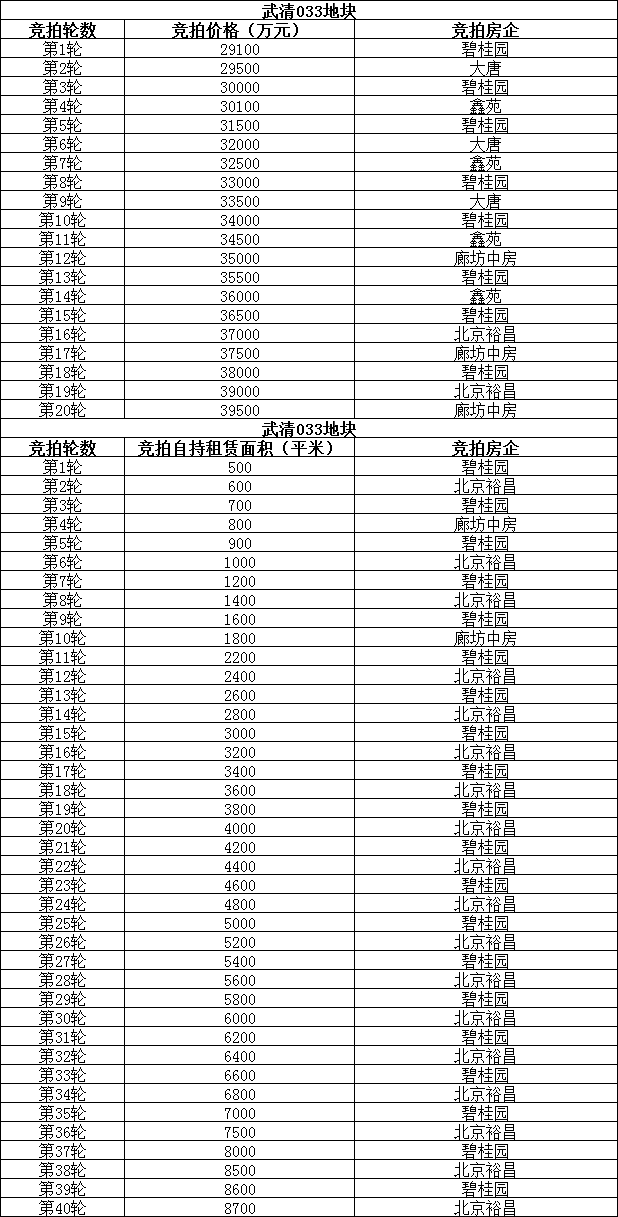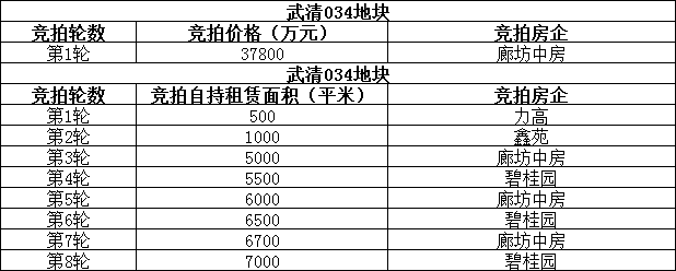 而后出让的034号宗地吸引了红星置业、北京裕昌、廊坊中房、力高、鑫苑、碧桂园、奥园、新城共计8家房企到场,同样,在摘牌之前也同样出现了2个报价,分别为底价2.71亿元与2.72亿元。竞拍环节中,2.72亿元起叫, 刚开场,廊坊中房就直接口头报出较高限价3.78亿,竞拍现场呼声一片,武清新城土地市场热度可见一斑!最终,在竞自持环节中,碧桂园以自持租赁住房建筑面积7000㎡斩获了这宗地块。