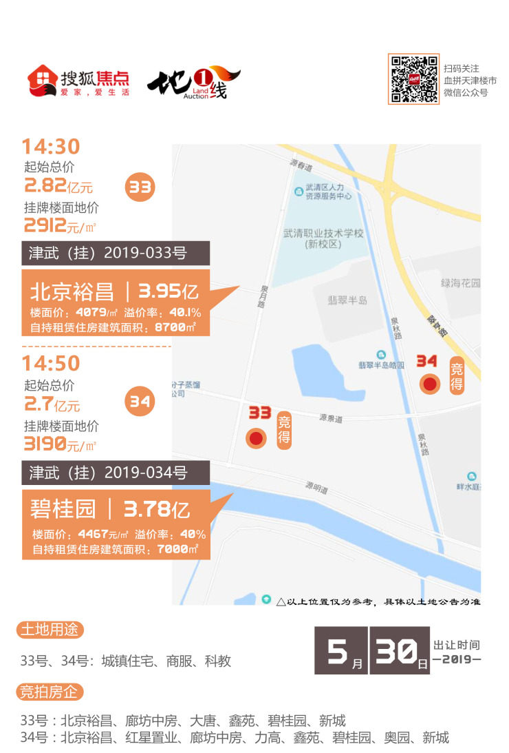 5月30日,天津土地交易中心有3宗地块摘牌,均位于武清区,编号分别为津武(挂)2019-033号、津武(挂)2019-034号、津武(挂)2019-040号。现场经过竞拍,最终津武(挂)2019-033号宗地被北京裕昌以较高限价3.95亿元摘得,楼面价4079元/㎡,溢价率40.1%,自持租赁住房建筑面积8700㎡。津武(挂)2019-034号宗地被碧桂园以较高限价3.78亿元摘得,楼面价4467元/㎡,溢价率40%,自持租赁住房建筑面积7000㎡。津武(挂)2019-040号宗地被花样年以较高限价6.26亿元摘得,楼面价6309元/㎡,溢价率40%,自持租赁住房建筑面积3000㎡。