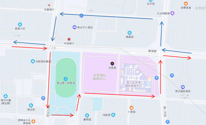 ➱如果需要北-南方向行驶,可从黄海路-第三大街-恂园东路-第二大街-黄海路 (绕行路线可参考下图的红色轨迹)。