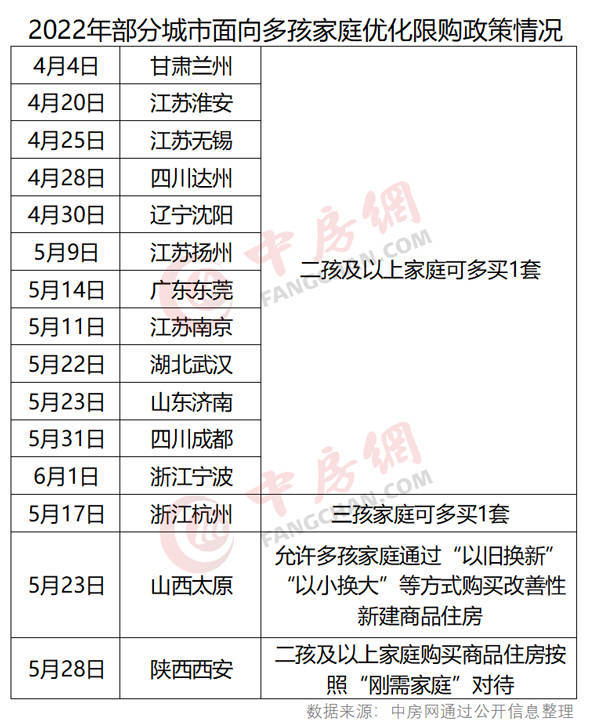 根据中房网梳理,目前已有太原、沈阳、南京、淮安、无锡、扬州、杭州、宁波、济南、武汉、东莞、成都、达州、西安、兰州等15城,先后面向多孩家庭“松绑”了限购,容许其可多购买一套商品住房或按刚需对待,其中省会城市占比达六成。