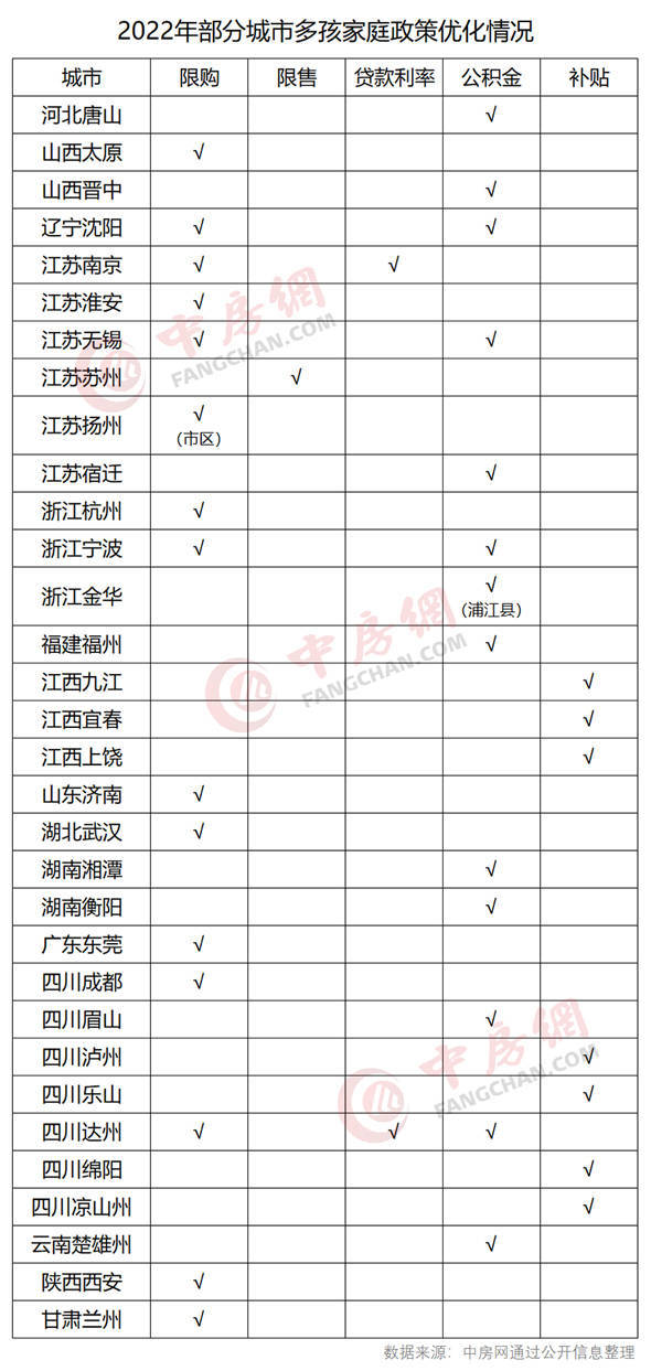 据悉,截至目前有超过30个城市通过多购住房,优化公积金政策,以及出台购房补贴等方式给予多孩家庭购房支持。