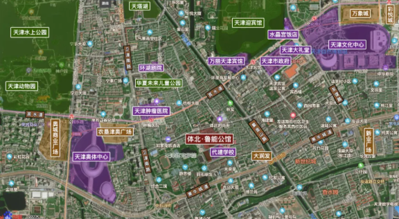 从区位上看,体北西侧隔卫津南路,是奥体中心;东侧隔紫金山路,是天津市政府;再向东过友谊路,是博物馆、大剧院等一众场馆;水上公园、肿瘤医院、奥城商业、……这些城市级配套也都在方圆2公里范围内。