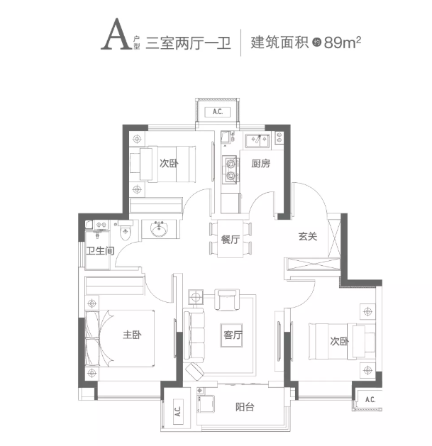 89平户型,总价门槛在100万,这个价格对于刚需客群非常友好。