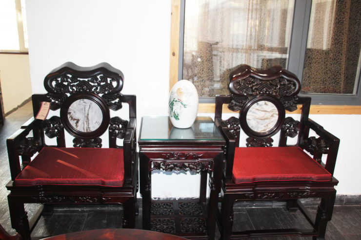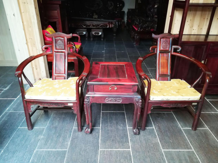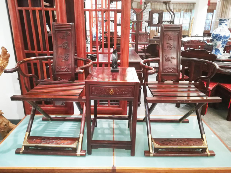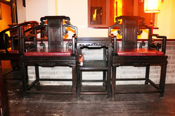 皇宫椅是圈椅的“升级版”,又叫“圈椅王”,在古时,有着严格的等级区别。与圈椅的朴素不同,皇宫椅更侧重高贵大气的气质。龙谦阁红木馆内的皇宫椅多是大红酸枝,与皇宫椅的气质十分匹配。由此也能看出馆主对各种款式的椅子深刻的理解。
