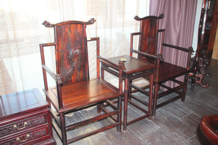 官帽椅分南官帽椅和四出头式官帽椅两种。所谓四出头,实质就是靠背椅子的搭脑两端、左右扶手的前端出头,背板多为“S”型,而且多用一块整版制成。南官帽椅的特点是在椅背立柱和搭脑相接处作出软圆角,由立柱作榫头,横梁作榫窝的烟袋锅式做法。椅背有使用一整版做成”S”形,也有采用边框镶板做法,雕有图案,美观大方。