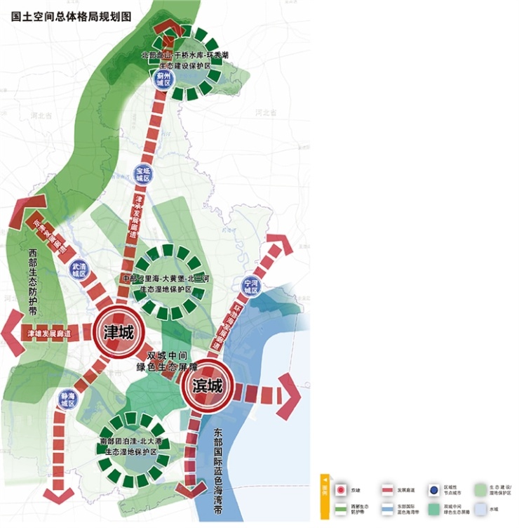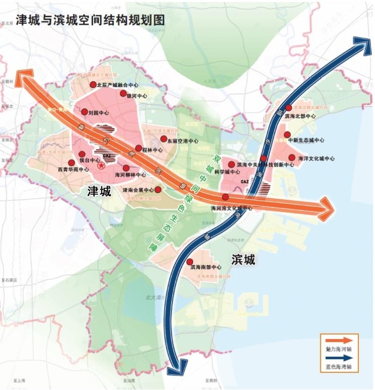 《规划》提出构建“双城、双轴、中屏障”的津城、滨城空间结构,明确了津城、滨城的规划范围。双城指现代活力津城和创新宜居的滨城;双轴指魅力海河轴和蓝色海湾轴;中屏障即双城中间绿色生态屏障。在此基础上,进一步细化了双城功能定位。