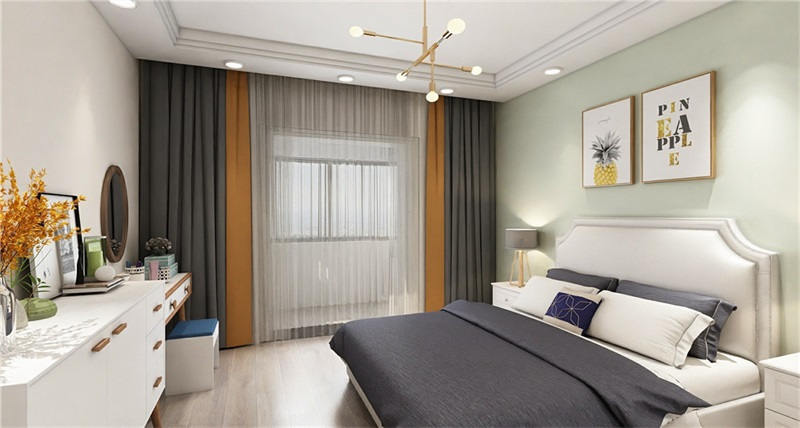 卧室墙面采用米色,家具统一采用白色,窗帘采用暗色,一亮一暗形成对比,符合现代风格的简约,灯具都采用简单的灯饰,总体上打造时尚简约。